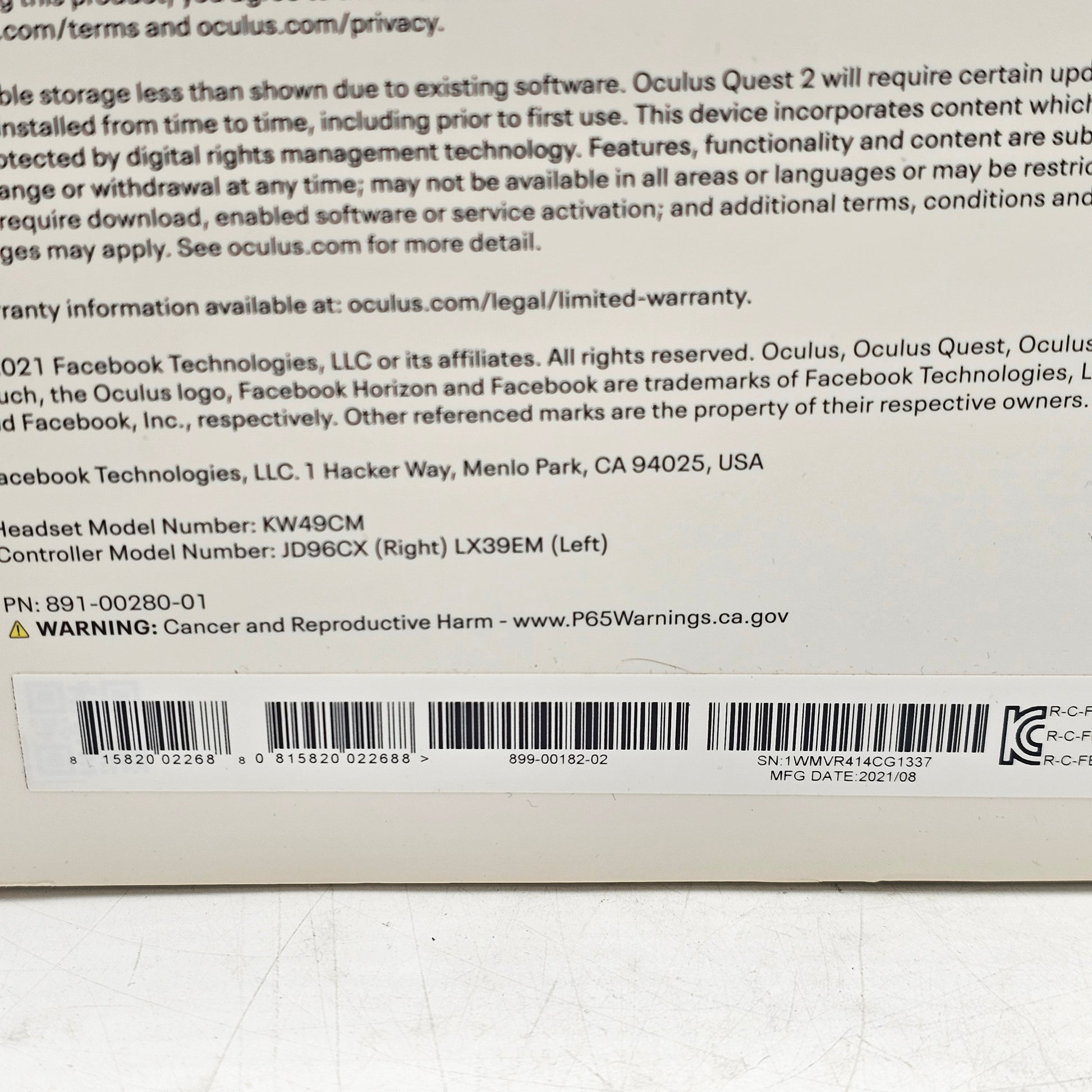 | Headset Serial# | 1WMVR414CG1337